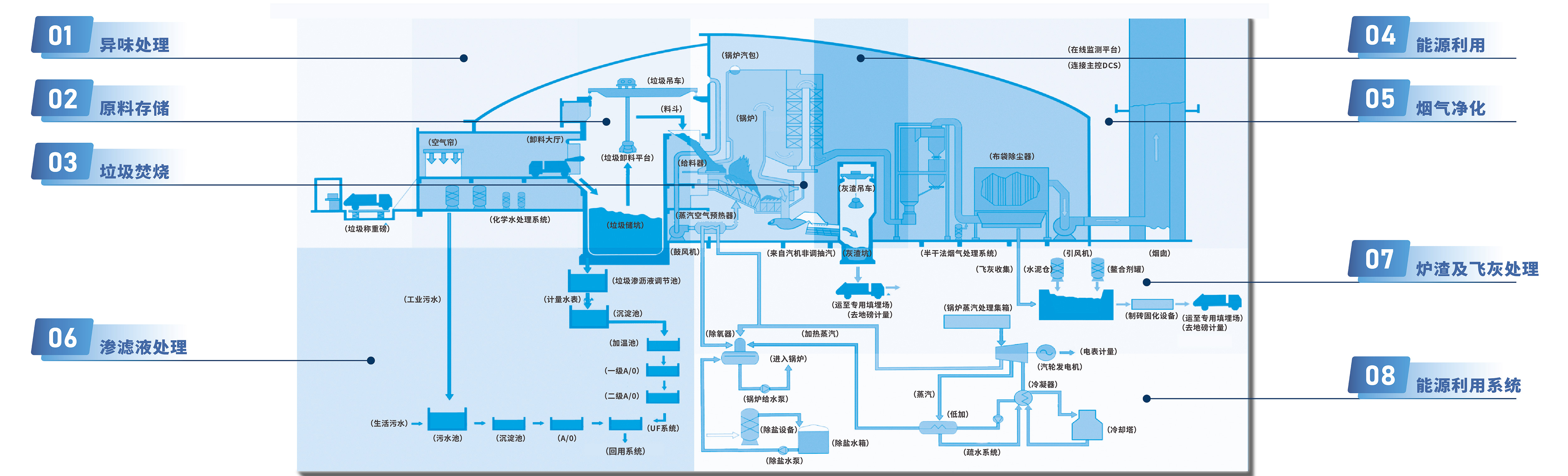 BB贝博艾弗森环境生活垃圾焚烧发电处理模式将全流程划分为八大模块,构建囊括垃圾入库、储存、焚烧,烟气净化、渗滤液处理、炉渣及飞灰处理、热能产生、能源利用的八大系统。